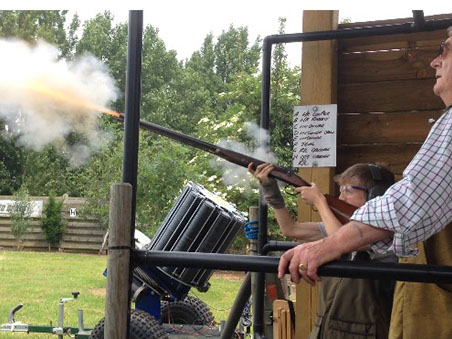 What about the battle of the doubles I hear you ask…. Well Martin and Bev were even at the start - Martin then goes 3 ahead and THEN misses 3 consecutive targets (one pair due to the schoolboy error of omitting to put shot down the barrels!) - which Bev then kills. Martin asks Bev, "are those second hand flints in your gun?" Bev assured him that they were indeed new flints and we can see that Bev really pushed the boat out for this tussle. So we’re now evens again with 4 targets to go. BEV misses 2 and Martin only one - SO Martin wins by one! However, the shooting performance Bev showed us with his flintlock was as good as you will ever see with one of these guns anywhere in the world! Don’t know about you but I’m knackered just writing this!