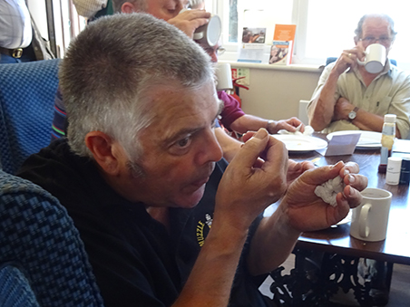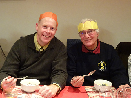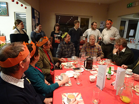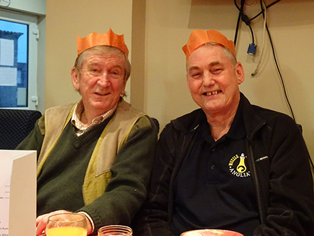 Paul R demonstrating rather well to Pete (SP) the 'right handed/right eye dominant (both eyes open) method of scoffing Xmas Pudding and custard.