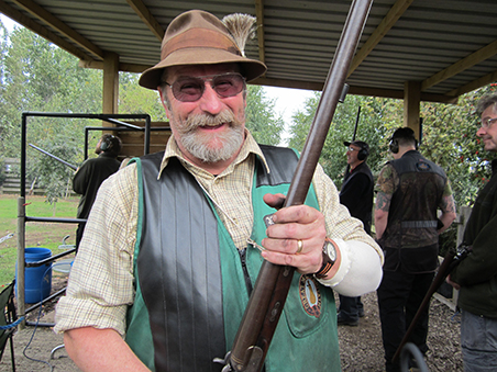 Bev, sometimes shooting both barrels of his double flintlock in the singles competition, caused some confusion to Sandra and his fellow shooters. However he shot very well, and there was negligible delay in the ignition of his gun, a joy to watch!! Recent newcomer Clive shot his new Pedersoli single and did extremely well. We hear a double 10 version is on its way! Martin, recovering after his recent operations, still managed a respectable 18/30 in the singles with his flintlock as did Dave Elvin, also using a Pedersoli Mortimer flintlock. Phil shot very well, his singles score increasing with every meeting. Dave Corneby (AKA The hairy shooter), continued his run of mediocre shooting with a 17. He's hoping for a return to form at Greystone Wood!!
