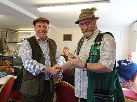 After the shoot, we all adjourned to the clubhouse for a warm drink and sustenance where the day's winners were announced and prizes given out. As it was April Fool's Day, as well as our normal averages prizes, Viking had very kindly made two special awards for the high gun winners - a very cleverly created clump of 'Fool's Gold'!! Little did Viking know at the time of donating these awards that he would be one of the recipients! I am also pleased to report that Robin, who won the singles, tells us that his 'Fool's Gold' has pride of place on a shelf in his lounge - a truly wonderful keepsake of his day!