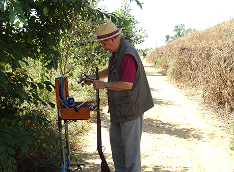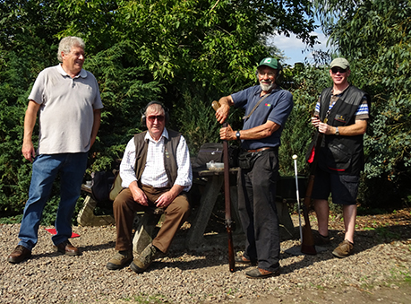 We had a real mixture in our squad. Out of the 8 shooters using breech loaders only 6 were using hammer guns. Dick, because of a medical condition, was using his over and under .410 with nitro cartridges. Paul Revere had brought along his dad Brian who, using a modern gun, shot some of the targets but was restricted as to what he could comfortably shoot because of a recurring medical condition. We also had 2 muzzleloaders, Clare and Paul Revere who were both using single barrel guns. Tony B was also shooting with us but had to retire after a couple of stands because of physical discomfort. Derek, because of another medical condition, was restricting himself to a load of ½ oz. This enabled him to compete and remain vertical throughout, but obviously had an effect on his performance. Anyway out of the remaining competition shooters it was tight at the top (nothing to do with the retention of money, although some may disagree!) with Tony R, Bushy and Bev vying for the top spot in this squad. The nemesis for all of us was stand 3 where try as we might none of us could connect with the left to right high quartering bird and to a lesser extent stand 4 where only Phil made any significant impression getting 4 from the 6 targets, the rest of us were floundering with a score of 3 or in most cases less. Most of the squad had moderate success on stand 5, although the sun and the smoke made it difficult to see some of the targets. The driven targets were handled well by some, in particular Tony R who only missed only 1 of the targets on the 2 driven stands, and not so well by others, no names no pack drill. Highest scorer in this squad was Bev with 28 which put him in 2nd position overall, closely followed by Bushy and Tony R with 27.