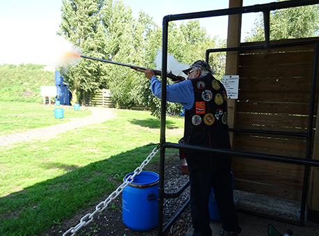 The squad started off on stand 4. The mini ‘snipe’ had to be shot extremely quickly for if it cleared the bank as it was severely wind-affected. Paul R noticed that the clay, after reaching its apex flew back toward the shooter giving the opportunity of a shot on its return journey. He naturally cashed in on this killing one of his 2 birds just before it made its landing. Most of the squad made a reasonable fist of the battue target. It was a baptism of fire for poor Mark who was familiarizing himself with the idiosyncrasies of his gun and muzzle loading in general. Martin, Clare, Bev and Paul R managed to hit 3 targets on this stand putting themselves in the driving seat. We then moved on to the 2 driven stands. Tony G decided not to shoot these as shooting these overhead birds irritated a back problem. Clare and Bushy excelled themselves here missing only 1 target each. Clare was now alone in the driving seat. Bev initially struggled with these as the gun and shooter became inconsistent, but by the end of driven section the penny had finally dropped and he realised that his gun needed the pan to be filled right up with primer to operate consistently on these overhead targets. On to stand 5 where the sun shone brightly in our faces, lovely for sun bathing but not shooting, even so the majority of the group shot these well with Bev and Bushy only missing one each, Martin and Paul R two. Clare lost a little bit of ground here missing three. Derek, Tony R and Tony G did not fare quite so well getting half marks or less. It was getting hot at the top with Clare and Bushy fighting for the lead in our squad and only one stand to go. Stand 6 saw some really top class shooting with Martin, Clare, Bushy, Paul R hitting all the targets, Bev missing one, Tony R and Derek two. Mark doubled his score on this stand so he finished on a high!