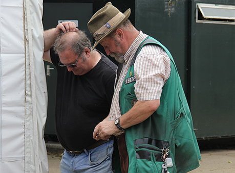 We started on Stand 6, 4 targets each shot twice. Jan from the Netherlands experienced misfires from the outset and had a shaky start, as did Archie. Martin and Mike got to grips with the targets well, the others taking half of them. Whilst loading under the cover of the marquee, Steve with his very long barrelled 7b commented that “this roof’s not high enough for me ramrod!!"