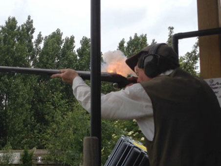 What about the battle of the doubles I hear you ask…. Well Martin and Bev were even at the start - Martin then goes 3 ahead and THEN misses 3 consecutive targets (one pair due to the schoolboy error of omitting to put shot down the barrels!) - which Bev then kills. Martin asks Bev, "are those second hand flints in your gun?" Bev assured him that they were indeed new flints and we can see that Bev really pushed the boat out for this tussle. So we’re now evens again with 4 targets to go. BEV misses 2 and Martin only one - SO Martin wins by one! However, the shooting performance Bev showed us with his flintlock was as good as you will ever see with one of these guns anywhere in the world! Don’t know about you but I’m knackered just writing this!