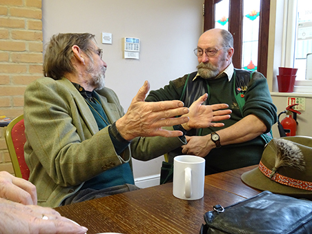 Bev showing Tim a pin fire cartridge (Well he was until he realised the camera was on him - "Cheese"!