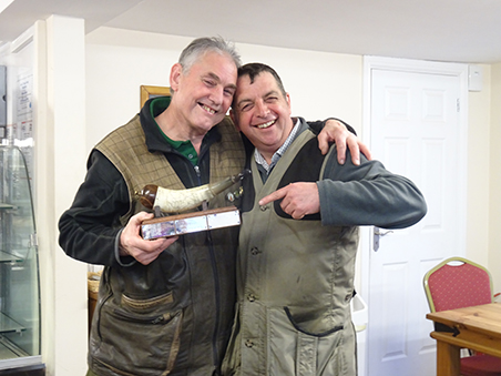 On to the final layout, the cold was now really getting to us and the club house seemed very appealing. The targets here weren’t that far away but they were incredibly quick, if you thought about them you had missed. Bev, the only one stupid enough to be using a flintlock, and doesn’t do much thinking, straighted this stand, leap-frogging the other competitors to win the coveted high gun trophy with a score of 26 from the 30 targets. He was closely followed by Dave Elvin on 25 and Clare on 24. Funnily enough most people shot above their average probably because of the relatively easy driven birds which boosted their confidence and their score. It was good to witness Dick shooting his newly-acquired 24 bore improve throughout the day only missing 3 targets on the last stand. Watch out all you small bore shooters!